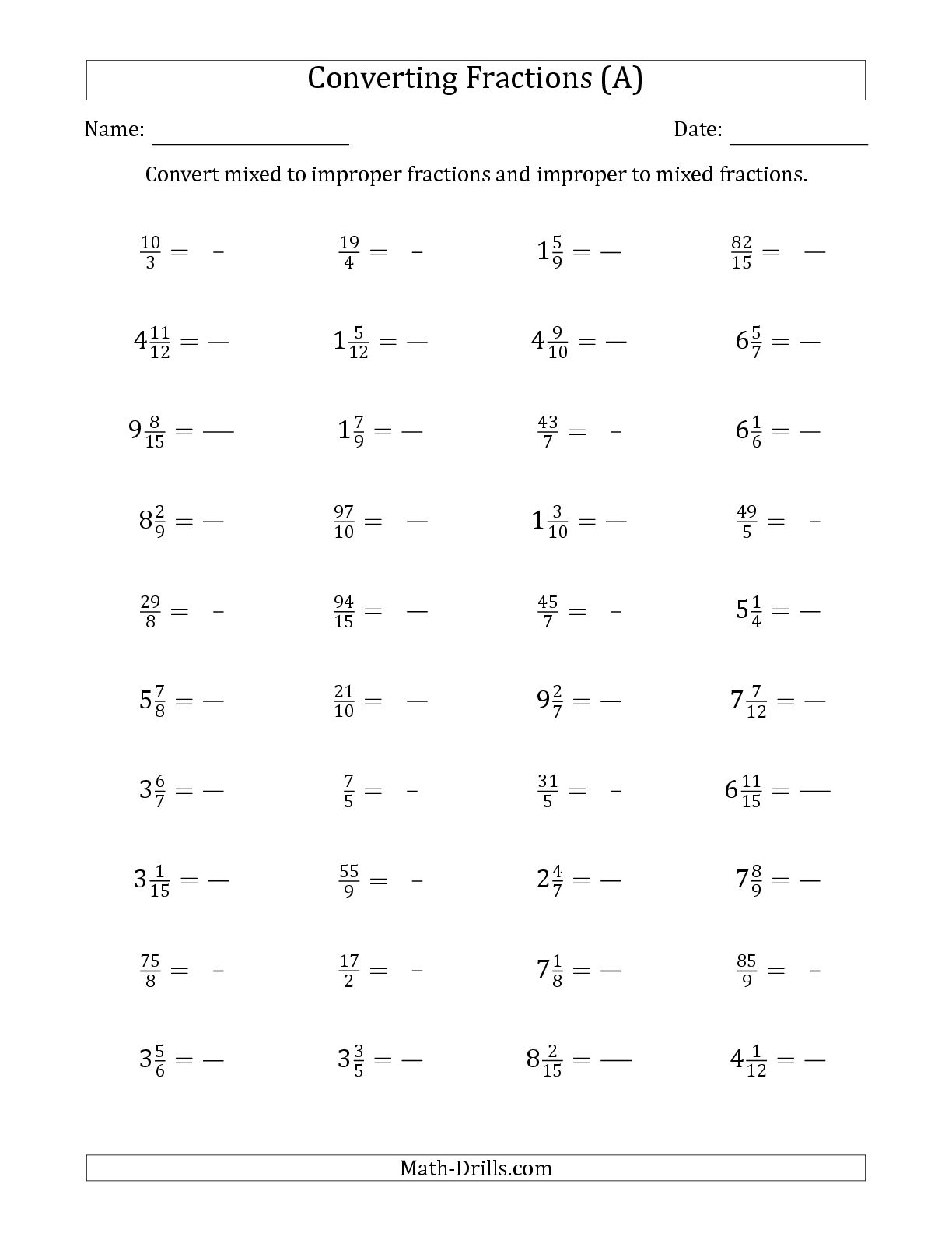 Free math worksheets improper fractions. Free Online Math Worksheets With Solutions A compilation of free math worksheets categorized by topics. Some worksheets are dynamically generated to give you a different set to practice each time. They are also interactive and will give you immediate feedback, Number, fractions, addition, subtraction, division, multiplication, order of operations, money and time worksheets, with video lessons, examples and step-by-step solutions. Free Fraction Worksheets and Printables - ThoughtCo Feb 19, 2020 · There are over 100 free fraction worksheets in PDFs below to support the many concepts encountered with fractions. When starting with fractions, begin by focusing on 1/2 and then a 1/4 before moving to equivalent fractions and using the 4 operations with fractions (adding, subtracting, multiplying and dividing) Browse Printable Fraction Worksheets | Education.com The first time kids discover that there’s more to math than whole numbers, they are likely to be a tad confused. And sometimes that confusion extends throughout the entirety of elementary school, where an initial introduction to concepts like numerators and denominators is followed by comparing fractions, adding and subtracting fractions, multiplying fractions, simplifying fractions and so on. Fractions Worksheets - Math-Drills Welcome to the fractions worksheets page at Math-Drills.com where the cup is half full! This is one of our more popular pages most likely because learning fractions is incredibly important in a person's life and it is a math topic that many approach with trepidation due to its bad rap over the years.